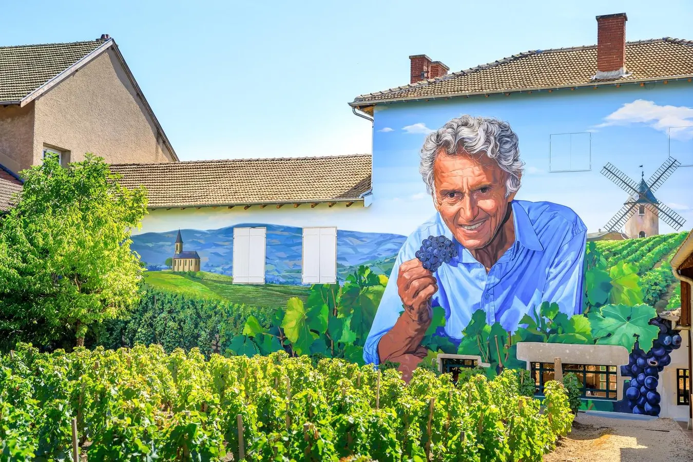 The Duboeuf team stand before a mural honoring founder Georges Duboeuf at the family’s estate in Beaujolais, with the iconic Moulin-à-Vent windmill painted behind them. Courtesy Georges Duboeuf