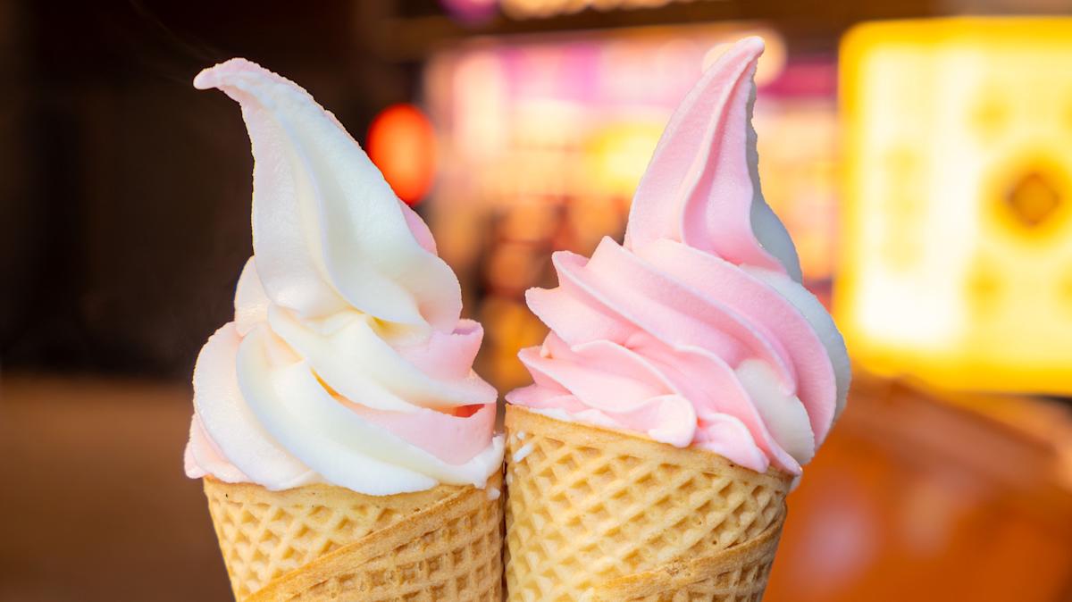 A pair of swirly mixed pink and white soft serve ice cream cones – Freer/Shutterstock